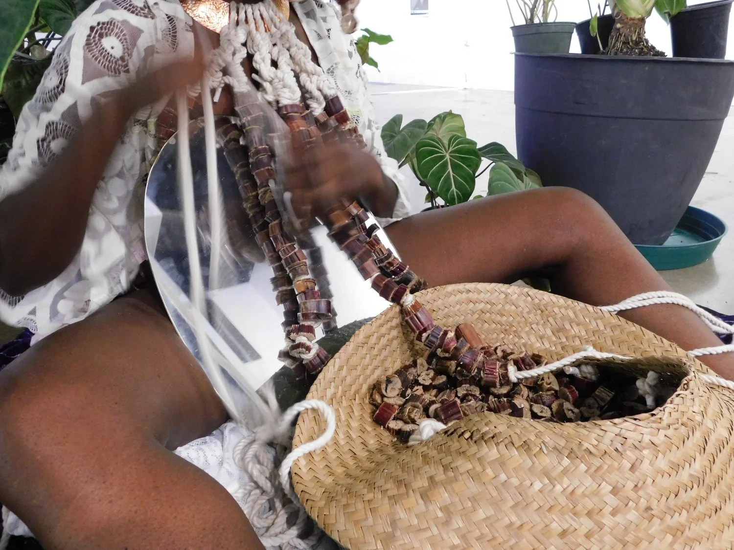 bête noire is a two day durational performance centered on sugarcane (“ahwedeɛ” in Twi), as both delight and vice. Using handmade beads made of black (red) sugarcane as a reference to African and Indigenous flesh, blood and bone, the performance interrogates commodification as it intercedes on behalf of the plant’s sacred nature. bête noire invites the public to act as co-intercessors through repetitive acts of adornment.